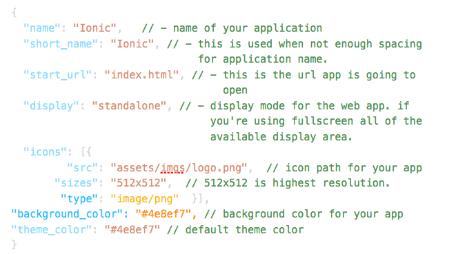 - This is the standard web manifest that comes with the app (manifest.json). Let’s go through each option: